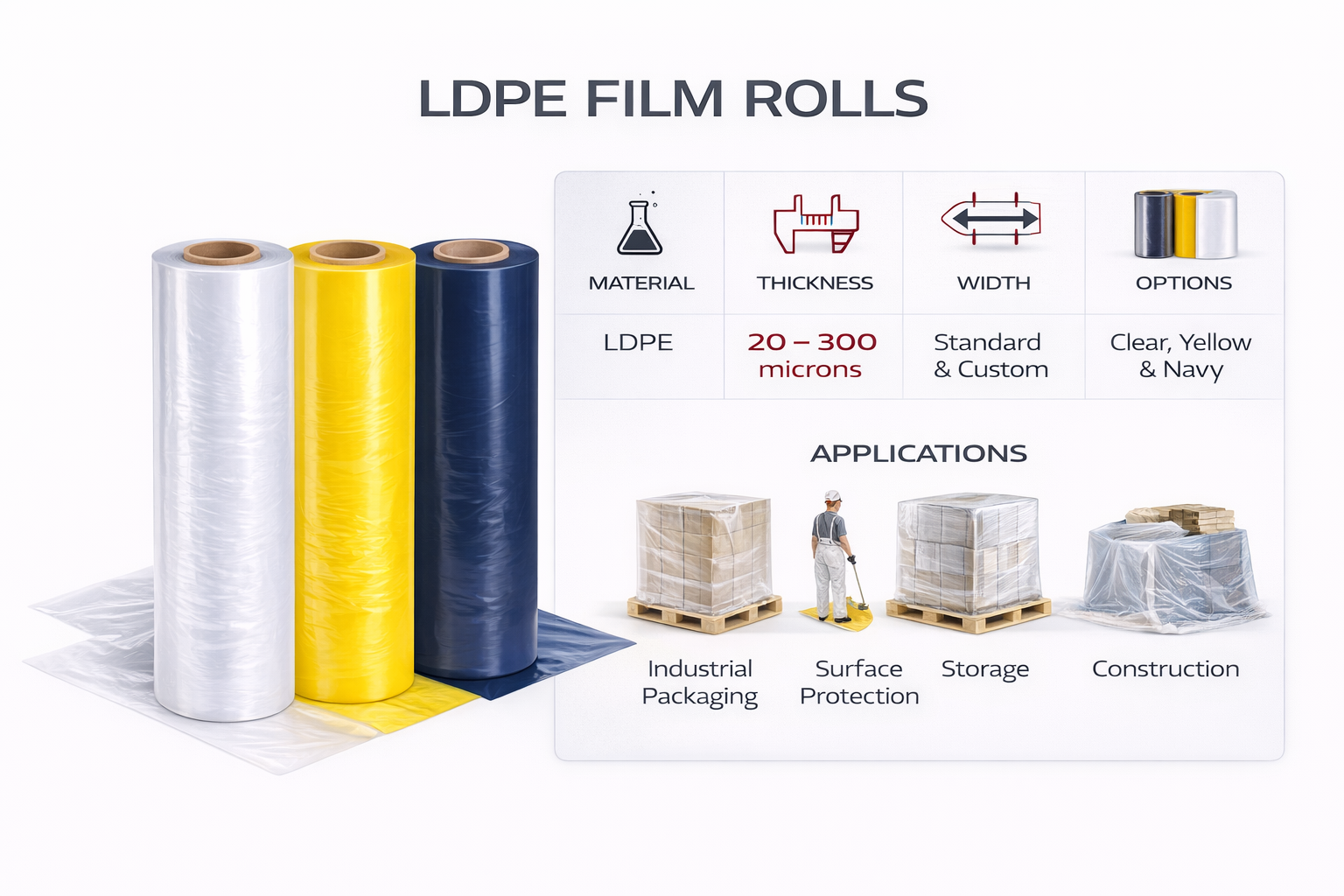 Farklı kalınlık ve genişlik seçenekleri ile üretilebilen LDPE Film Roll; otomatik ve manuel uygulamalara uygundur. Şeffaf veya opak üretim seçenekleri ile ihtiyaca özel çözümler sunar.
