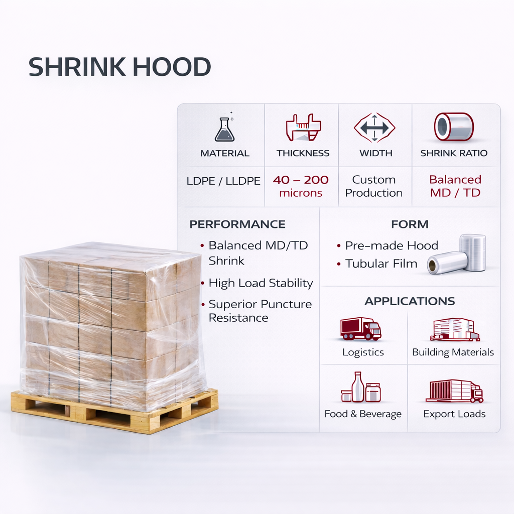 Shrink Hood, paletli yüklerin güvenli, stabil ve uzun süreli korunması için geliştirilen yüksek performanslı bir ambalaj çözümüdür. Isı uygulaması sonrası ürün formuna tam uyum sağlayarak palet üzerindeki yükü tek parça halinde sarar ve maksimum stabilite sağlar.